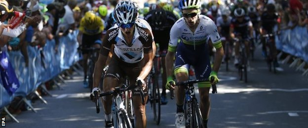 Sagan's fourth place earned him enough points to take the green jersey from Germany's Andre Greipel. The Slovakian leads on 213 points with Greipel on 210 and Britain's Mark Cavendish third on 159.
